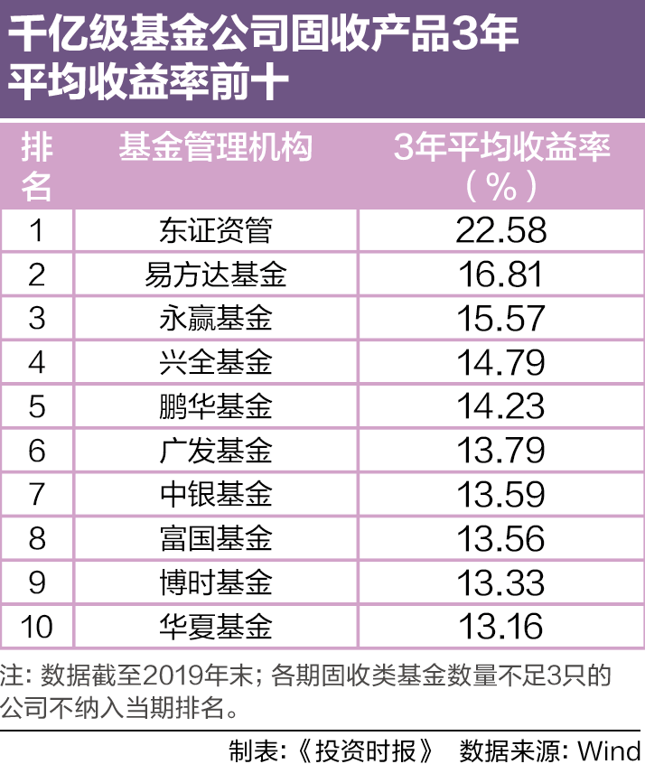 在2017年—2019年3年期间,能获取业绩数据的固收类基金平均收益率为12.03%。在千亿规模的基金管理机构中,有19家公司超过这一水平。