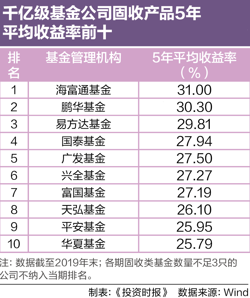 在《中国基金业马拉松大师榜·2020》中,固收类基金5年期平均收益率达到22.12%。从公司层面来看,在千亿规模的基金管理机构中,有10家公司的平均收益率超过了25%,包括海富通基金、鹏华基金、易方达基金、国泰基金、广发基金、兴全基金、富国基金、天弘基金、平安基金和华夏基金。