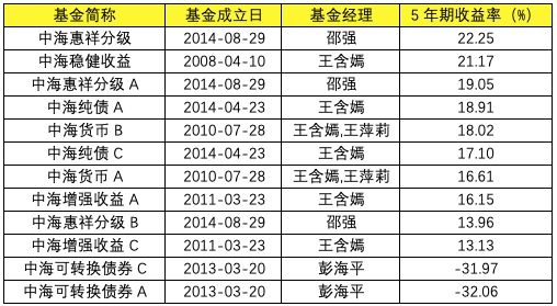 在3年期固收类基金平均收益率的排名中,中海基金以8.14%排在同行倒数第5位。Wind数据显示,在混合债券型二级基金3年期平均收益率达到12.34%的情况下,归属于这一类别的中海可转换债券A、中海可转换债券C的收益率不足1%,中海合嘉增强收益A、中海合嘉增强收益C的收益率也在5%以下。而其3年期表现最好的固收基金中海惠祥分级,收益率只有12.99%,稍高于平均线。