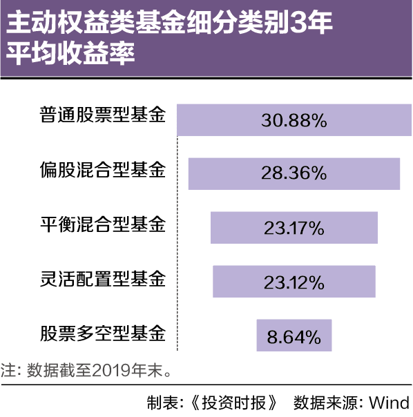 按照Wind数据分类,将A股主动权益类基金进一步细分,整体表现最为突出的是普通股票型基金,平均收益率为30.88%。在此类产品中,信达澳银新能源产业、易方达消费行业、嘉实新兴产业过去3年净值翻倍,收益率依次为126.88%、116.35%、107.33%。同时,有31只基金的净值出现下跌,包括金鹰量化精选、汇丰晋信低碳先锋、大摩量化多策略等。