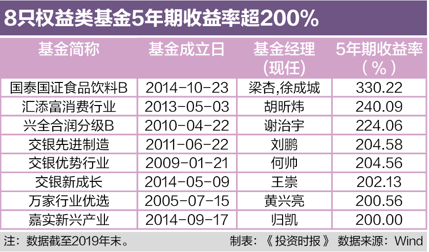 其中,有142只主动权益类基金的净值在过去5年翻倍。表现最好的是汇添富消费行业,收益率达到240.09%。紧随其后的是兴全合润分级B,收益率达224.06%。交银先进制造排名第3,收益率为204.58%。上述3只产品均为偏股混合型基金。此外还有4只基金的收益率超过200%,由高至低依次为交银优势行业、交银新成长、万家行业优选和嘉实新兴产业。