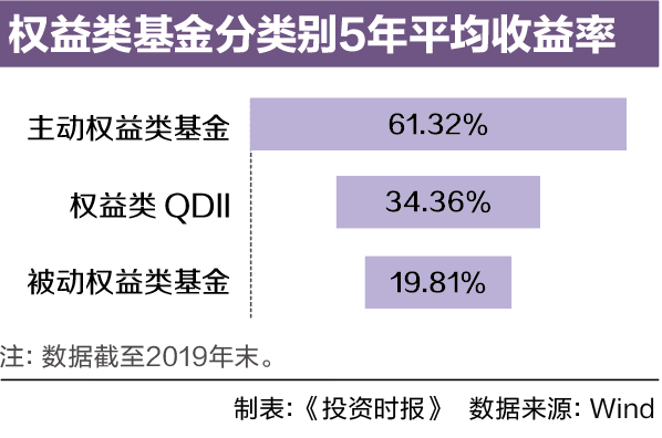 分类别来看,过去5年A股主动权益类基金平均收益率达61.32%,被动权益类基金平均收益率为19.81%,而权益类QDII平均收益率为34.36%。