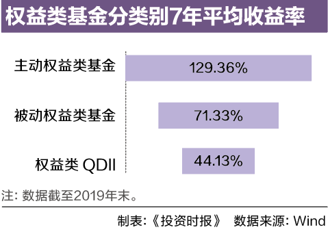 与3年期业绩所不同的是,当时间延长至7年,权益类QDII的整体表现不如A股权益类基金。前者平均收益率为44.13%,获得正收益的产品比例只有77.05%。