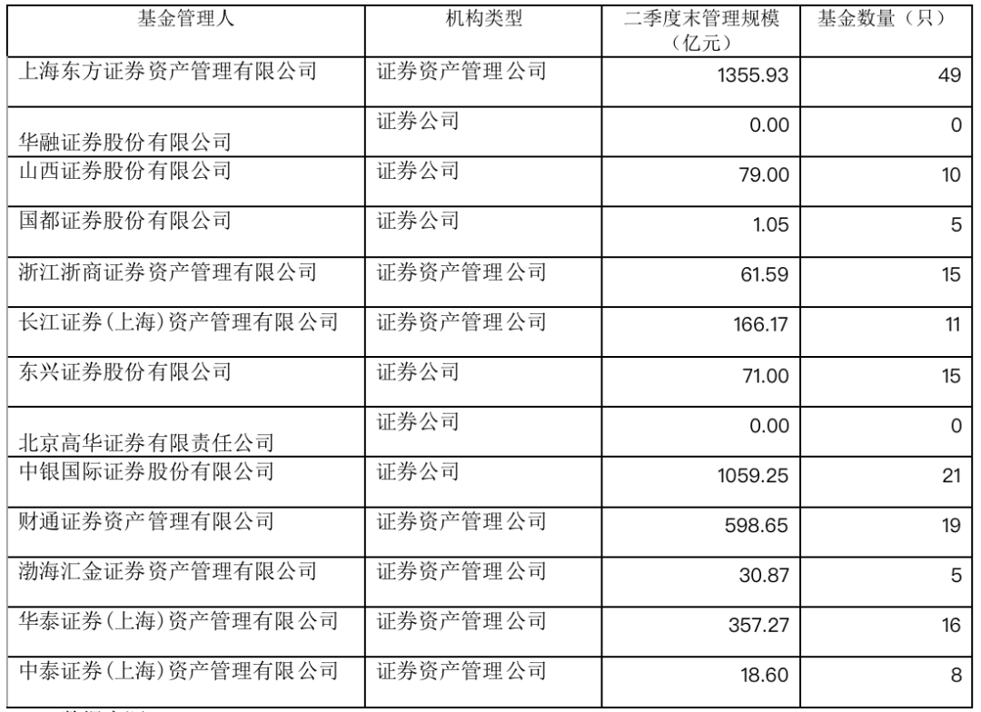 譬如,截至今年二季度末,有上海东方证券资产管理有限公司(下称东证资管)、中银国际证券股份有限公司(下称中银国际证券)管理规模均破千亿,而国都证券管理规模尚不足2亿元。