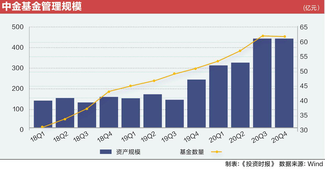Wind数据显示,截至2020年三季度末,中金基金管理规模为448.1亿元,较2019年同期的132.22亿元上涨了315.87亿元,且管理规模已连续四个季度上涨,不过其管理规模飙升主要是固收类基金带动。