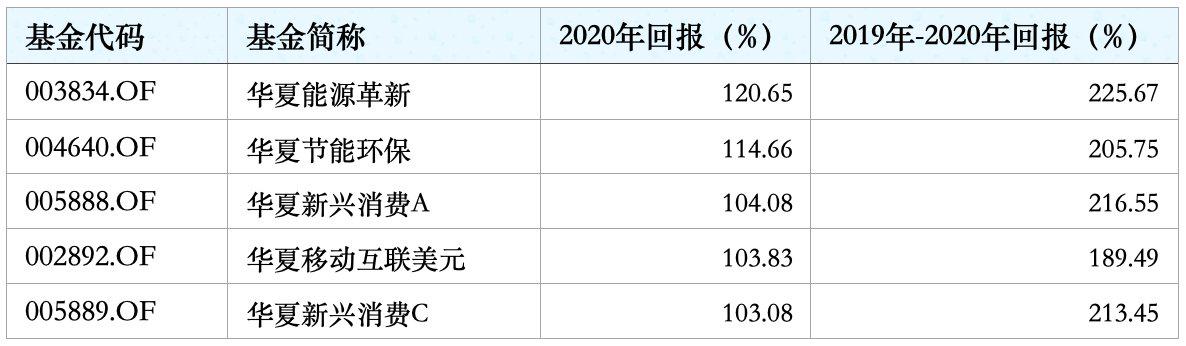 华夏基金旗下5只产品2020年净值翻倍