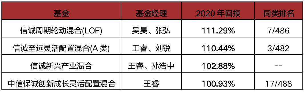 具体来看,银河证券数据显示,聚焦于大消费赛道的信诚周期轮动2020年收益率达111.29%,在同类产品中排名第7/486。瞄准科技赛道的信诚至远A收益率为110.44%,同类排名3/482;中信保诚创新成长收益率为100.93%,同类排名17/488。锚定新能源车和光伏领域的信诚新兴产业2020收益率则为102.88%。