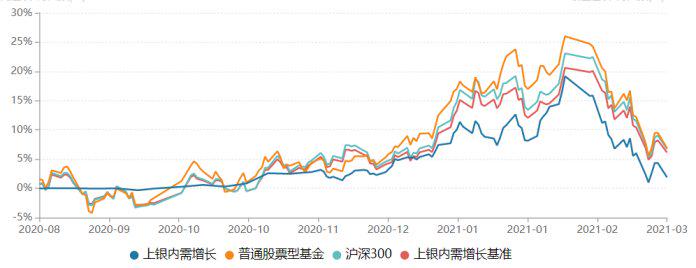 以上银内需增长为例,基金季报显示,去年四季度该基金份额净值增长率为7.46%,同期业绩比较基准收益率为12.26%。