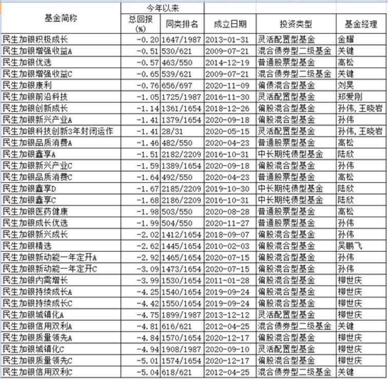民生加银旗下30只基金年内收益率告负