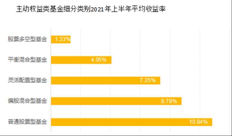 分类别来看,在跌宕起伏的上半年,普通股票型基金的整体表现最为出色,以10.84%的平均收益率领先于其他品种;偏股混合型基金上半年业绩亦相当抢眼,纳入统计的1660只产品平均收益率为8.78%;紧随其后的为灵活配置型基金,平均收益率则为7.35%;而平衡混合型基金、股票多空型基金表现相对逊色,平均收益率分别为4.05%、1.33% 。