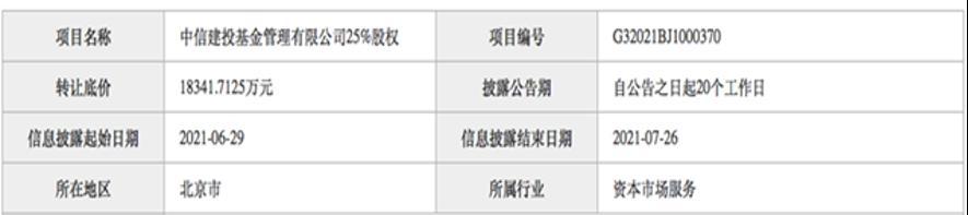 北京产权交易所官网显示,航天财务将其持有的中信建投基金25%股权挂牌转让,转让底价为1.83亿元,信息披露期限为6月29日至7月26日,价款支付方式为一次性付清。