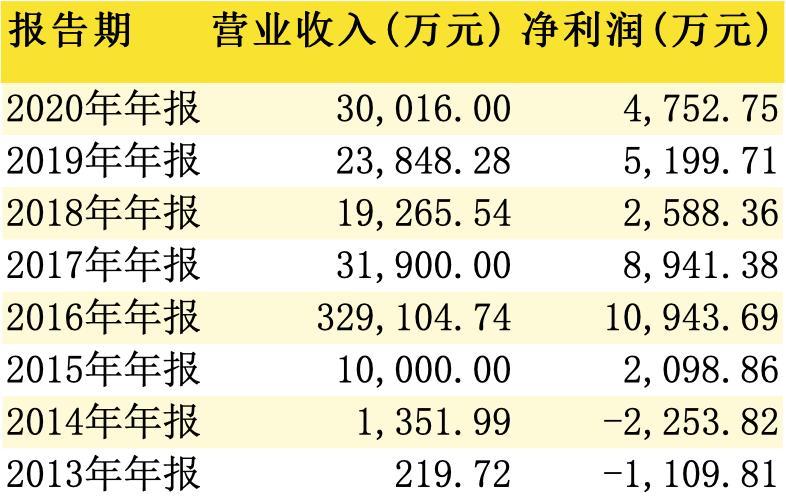 据统计, 2013年至2019年,该公司营业收入分别为291.72万元、1351.99万元、1亿元、32.91亿元、3.19亿元、1.93亿元、2.38亿元,净利润分别为-1109.81万元、-2253.82万元、2098.86万元、1.09亿元、8941.38万元、2588.36万元、5199.71万元。