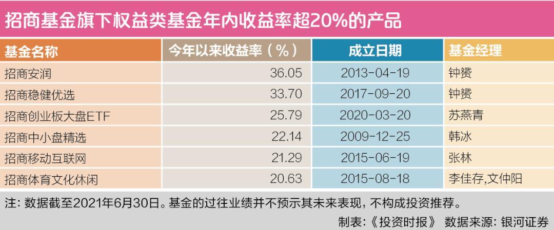 银河证券数据显示,剔除今年以来新成立的基金后,招商基金旗下有招商安润、招商中小盘精选、招商创业板大盘ETF等31只权益类基金上半年收益率超过10%(各类份额分开计算,下同)。