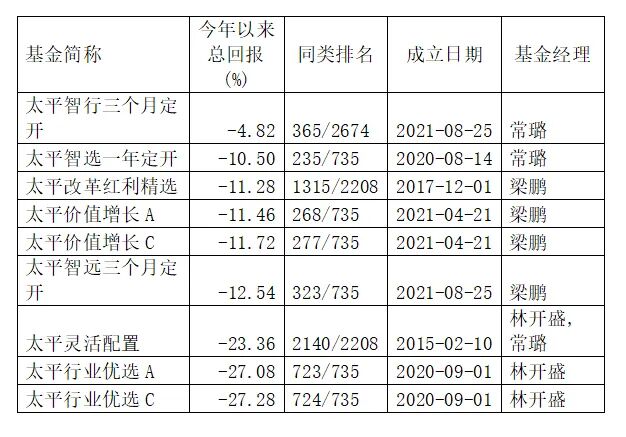 基金经理梁鹏、常璐所管理的主动权益类基金今年以来业绩表现也欠佳。据统计,梁鹏在管的太平改革红利精选、太平智远三个月定开、太平价值增长A/C等3只产品年内净值跌幅均超过11%,而常璐管理的太平智行三个月定开、太平智远三个月定开年内净值下跌幅度分别为4.82%、10.5%。