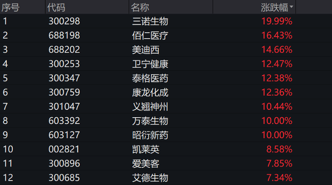 26日,医疗板块受到三季报利好催化飙涨,领涨两市,三诺生物20%涨停,CRO板块集体飙升,佰仁医疗涨超16%,美迪西涨近15%,卫宁健康、泰格医药、康龙化成均涨超12%,义翘神州涨超10%,昭衍新药、万泰生物涨停,凯莱英涨超8%,医美龙头爱美客涨超7%,眼茅爱尔眼科涨超6%,医疗白马股悉数大涨。