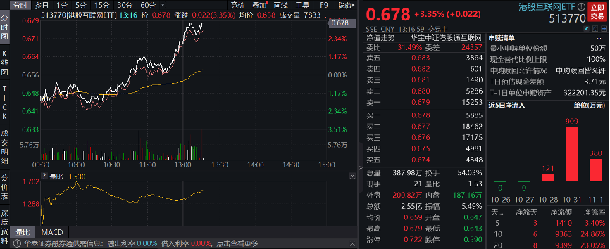 热门ETF方面,港股互联网ETF(513770)早盘低开后拉升转涨,涨幅迅速拉大,现大涨3.35%,成交额超2.6亿元,盘中持续溢价交易,溢折率高达0.59%。