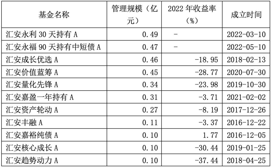 2022年末汇安基金旗下11只迷你基金规模、业绩情况