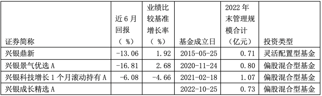 截至3月22日,兴银鼎新、兴银景气优选A过去六个月收益率分别为-13.06%、-16.81%,业绩比较基准收益率为1.92%、2.68%。