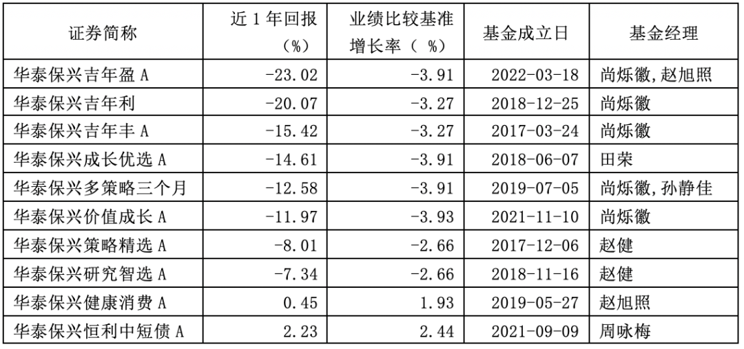 权益基金方面,数据显示,除了华泰保兴吉年丰A、华泰保兴吉年利之外,截至3月24日,华泰保兴吉年盈A、华泰保兴成长优选A、华泰保兴多策略三个月、华泰保兴价值成长A、华泰保兴策略研究A、华泰保兴研究智选A、华泰保兴健康消费A的过去一年净值增长率分别为-23.02%、-14.61%、-12.58%、-11.97%、-8.01%、-7.34%、0.45%,均不敌同期业绩比较基准收益率。