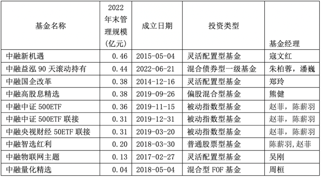 《投资时报》研究员注意到,截至2022年末,中融基金旗下有10只基金规模低于5000万元,其中权益类基金、债券型基金各有9只和1只。