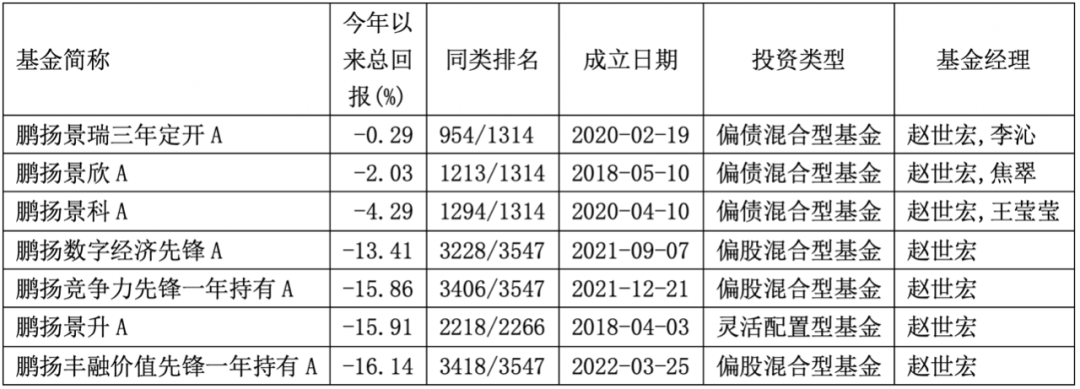《投资时报》研究员注意到,赵世宏单独管理的鹏扬数字经济先锋A、鹏扬竞争力先锋一年持有A、鹏扬丰融价值先锋一年持有A3只产品成立以来总回报不佳,分别为-40.74%、-31.98%、-20.22%。
