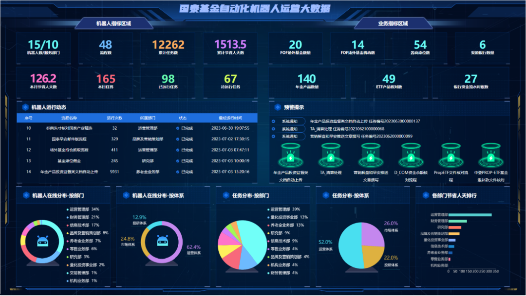 国泰基金作为产品线齐全的综合性、多元化的大型资产管理公司之一,同时也具有产品数量多、业务条线多元化、跨部门协作沟通繁复的特点,数字员工也成为打造内部运营数智化升级的重要能量。在零售、年金、品牌及营销策划、运营、IT、财务等多部门已部署超10个数字自动化场景进行内部运营效率提升,提升工作效率达80%以上。通过数字员工实现跨平台数据联动,产品管理平台与监管报送、数据中心、估值系统等平台打通,实现产品信息共享,解决信息孤岛问题。减少近80个信息重复录入工作,帮助中后台业务人员减少不必要的重复操作,提高工作效率。与此同时,养老金业务部通过数字员工自动处理邮件,实现对产品及时跟踪维护,并回复执行情况,累计处理248封邮件。定期批量自动化更新信息披露季报年报类文件,累计864份。每日自动化监控产品资金入账信息情况,及时通知客户经理、投资经理、风控等相关人员,帮助业务及时进行投资,提高产品资金运作效率,大大降低业务人员手工操作工作量。运营管理部通过数字化员工持续优化运营流程,自动处理头寸核对、监管报送、场外基金跟踪、ETF文件核对、资金余额核对等诸多繁琐手工操作,节省大量人力。