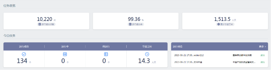 目前已搭建融合RPA与AI的数字化员工平台,用以协助全公司,投研、市场、运营三大体系10余个部门,涉及投研决策、量化ETF业务、市场营销、产品管理、资金跟踪提醒、场外基金跟踪、TA估值运营、资金核对、监管报送、IT系统运维、财务报销等多个场景,共部署15个数字化员工。公司通过采用数字化员工全替代和人机交叉复核两种模式,对大量日常性工作及流程进行改造,同时构建数字化员工统一监控平台,既提升了工作效率,又有效防范了风险。完成每日近万级信息与数据交互、业务执行,累计节省人工工时超 1500 人天,部分流程业务处理效率提升 100%,人工数据核对时间减少 60%,数据准确率达 99.36%,获得广泛良好反馈,在准确、高效的前提下切实提高了工作效率,减轻了业务人员的工作量,提高了准确率。尤其是在提升业务效率、强化业务流程执行规范、提升业务品质、增强客户体验等方面完成了新突破。