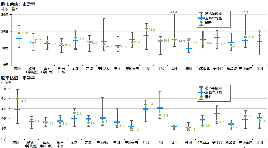 图表中美国股票的估值数据基于标准普尔500指数,中国A股的估值基于沪深300指数,其他各地区股票的估值数据基于该地区的MSCI 全收益指数。市盈率及市净率以本地货币计价计算。对于部分地区,为展示需要,市盈率的15年区间已做截断处理。过往表现并非当前及未来业绩的可靠指标。
