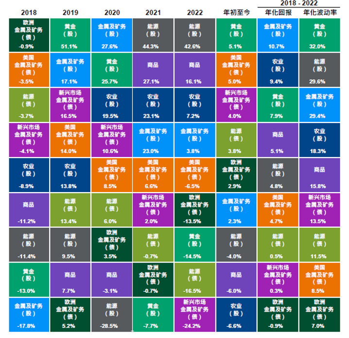 综合来看,过去五年(2018年—2022年),金属及矿务(股)、农业(股)、黄金(股)、商品的年化回报率均超过5%,依次为10.7%、9.4%、7.9%、5.1%。欧洲金属及矿务(债)的年化回报垫底,为-0.9%,同时波动也最小,年化波动率为7.0%。而波动最高的是黄金(股),年化波动率为32.0%。能源(股)、金属及矿务(股)的波动也较大,年化波动率分别为29.6%、29.4%。