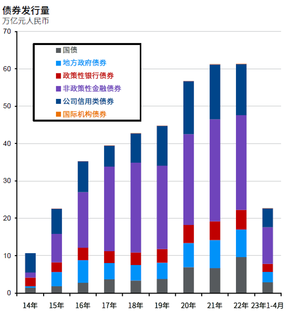 《环球市场纵览—中国版》显示,2014年—2022年期间,中国债券发行量持续上升,2021年、2022年均突破60万亿元。从近几年的数据来看,体量最大的是非政策性金融债券。