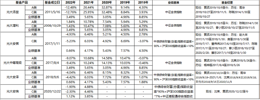 资料显示,光大添益、光大增利皆由公司总经理助理、固收多策略投资部总监黄波单独管理,他已有11年固定收益研究经验,逾7年组合管理经验,擅长可转债类资产投资,善于挖掘高性价比产品。对于不同风险等级的产品,黄波采用不同策略。可转债方面,针对追求稳健的产品采用偏稳健风格的策略,对于积极型产品则基于股票投资思路构建组合;股票方面,优选景气度向上板块或均衡配置行业;纯债方面,采用宏观分析和微观定价两个方面进行债券投资组合的构建,通过对各宏观变量的分析来确定组合久期的合理范围,并重视债券流动性。