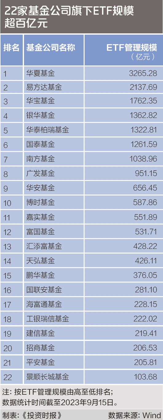 从基金公司维度来看,根据Wind数据,截至9月15日,业内有54家基金公司布局ETF产品,最新管理规模超过100亿元的基金公司有22家。其中七家基金公司旗下ETF规模超过千亿元,包括华夏基金、易方达基金、华宝基金、银华基金、华泰柏瑞基金、国泰基金、南方基金。与去年末相比,国泰基金是新晋成员。