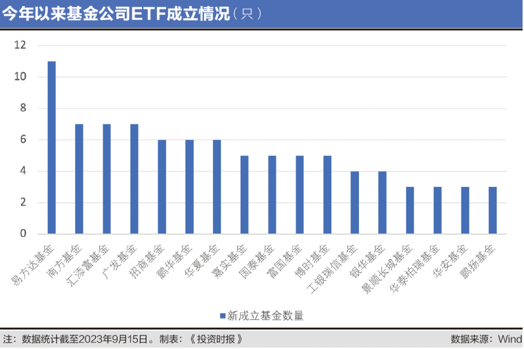 具体来看,年内成立的100只ETF新基金来自25家基金公司,旗下新添五只及以上ETF的基金公司有11家。其中易方达基金旗下有11只新品面世,是今年以来发行ETF新基金最多的基金公司。