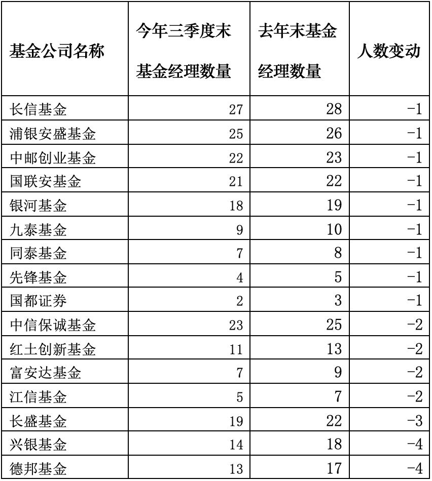 不过,有基金公司的基金经理数量在今年前三季度逆势缩水。《投资时报》研究员统计发现,今年以来有16家基金公司的基金经理数量较去年末减少,整体以中小型基金公司为主。