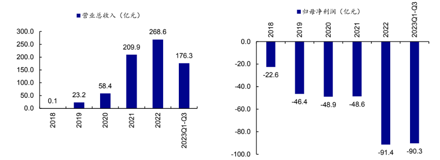 查阅近年的业绩走势,《投资时报》研究员注意到,自2018年起,小鹏汽车的营收呈现上升趋势,但同期归母净利润却持续下滑。进入2022年后二者背离的走势更加明显。财报显示,小鹏汽车2022年收入创出268.6亿元的近年新高,但净亏损则为91.4亿元,也达到近年来的最大值。步入2023年后,小鹏的情况似乎并未明显好转,其前三季度营收约为176.3亿元,而同期净亏损则约为90.3亿元,已接近2022年全年净亏损幅度。