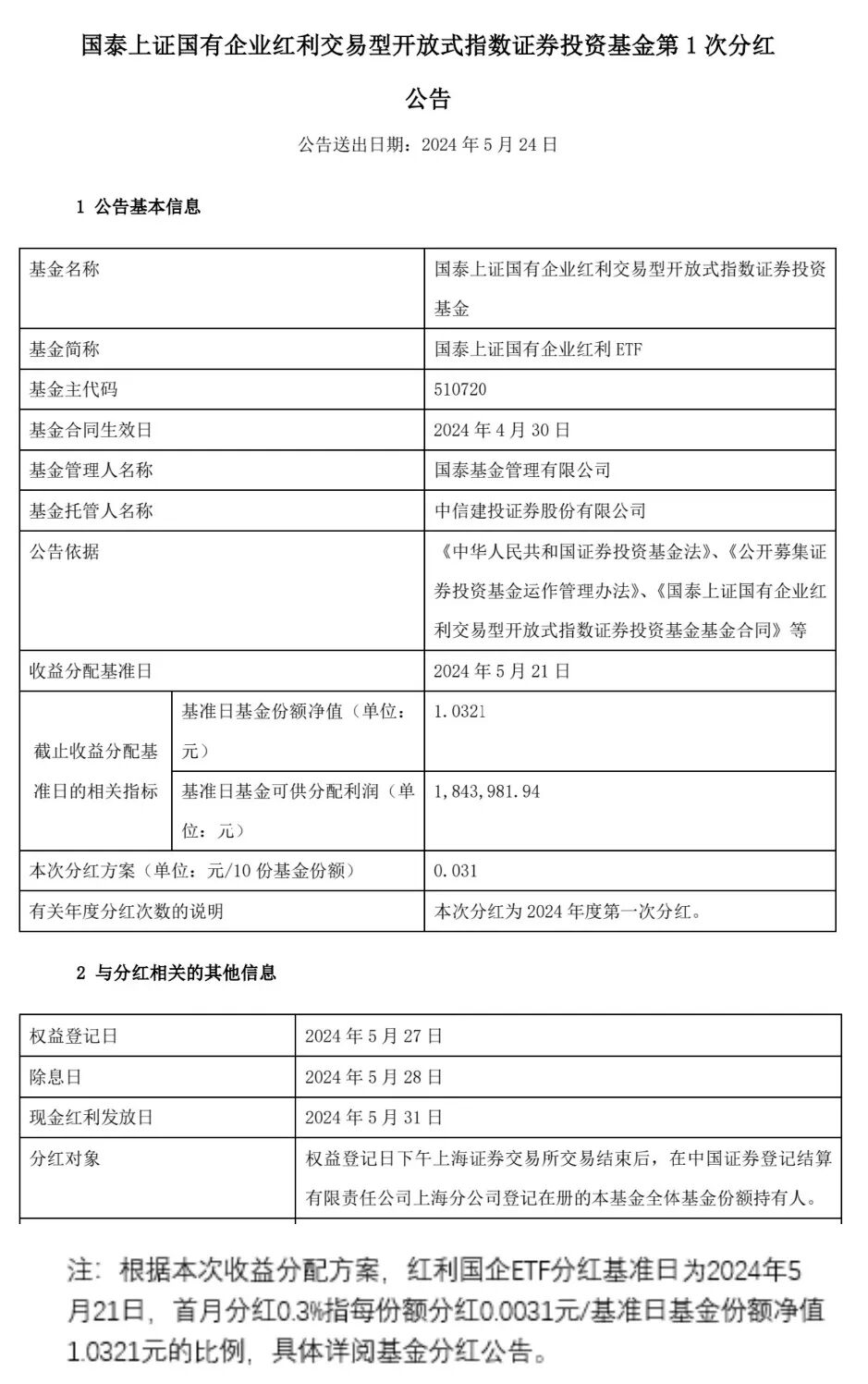 5月24日,红利国企ETF(510720)宣布分红。根据公告,本次分红方案为0.031元/10份基金份额。权益登记日为5月27号,现金红利发放日为5月31日。