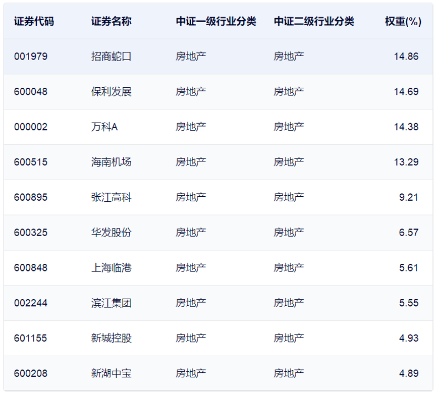 这个问题我还真的认真琢磨过:投资ETF关键看其跟踪的标的指数,而地产ETF(159707)跟踪的是中证800地产指数(399965),是一只龙头效应非常明显的地产类指数,从中证指数公司最新披露的资料来看,该指数的样本股数量仅为10余只。截至2024年6月20日,该指数的前十大重仓股资料如下: