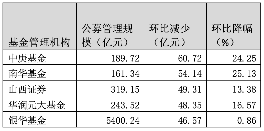 据Wind数据统计,截至2024年二季度末,全市场有48家基金管理机构的公募管理规模较一季度末下滑。其中,管理规模环比缩水排前五名的分别是中庚基金、南华基金、山西证券、华润元大基金、银华基金,环比分别减少60.72亿元、54.14亿元、49.31亿元、48.35亿元、46.57亿元。