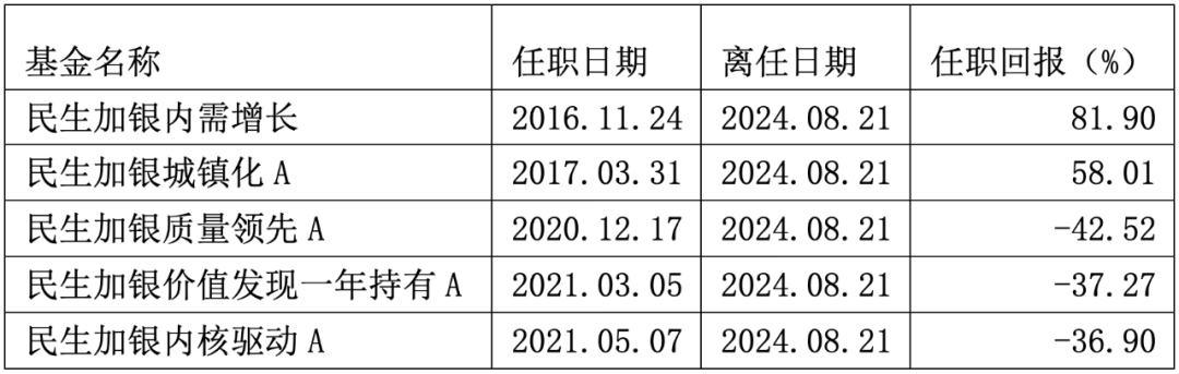 8月21日,民生加银内需增长、民生加银城镇化、民生加银质量领先、民生加银价值发现一年持有、民生加银内核驱动均发布基金经理变更公告称,基金经理柳世庆因个人原因于当日离任。