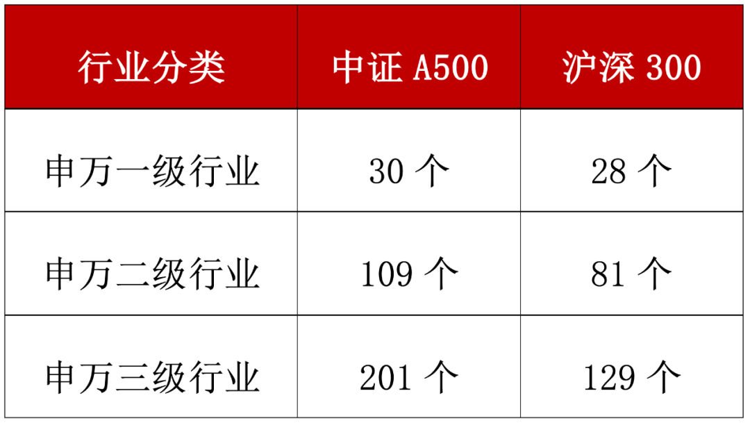 根据Wind数据,截至2024年11月4日,中证A500指数覆盖申万一/二/三级行业的数量分别为30个、109个、201个,高于同期沪深300指数覆盖的行业数量。