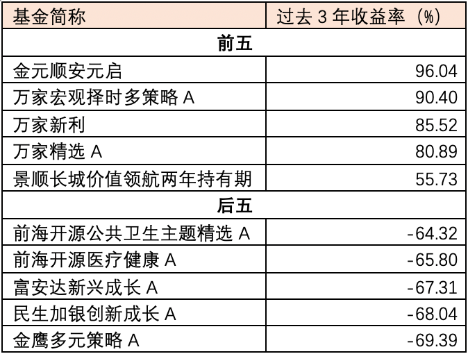 具体来看,居首的是金元顺安元启,收益率为96.04%,跑赢业绩比较基准收益率101个百分点。其次是万家宏观择时多策略A,收益率为90.40%。全行业中,过去3年收益率超过90%的基金只有上述两只。