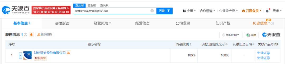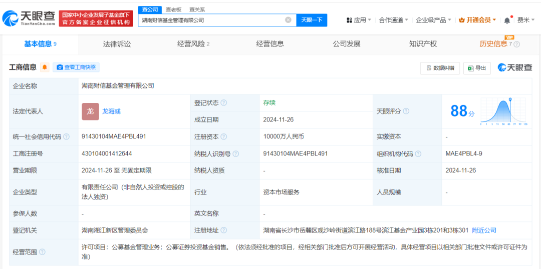 天眼查App显示,近日,湖南财信基金管理有限公司成立,法定代表人为龙海彧,注册资本1亿人民币,经营范围为公募基金管理业务、公募证券投资基金销售,由财信证券股份有限公司全资持股。