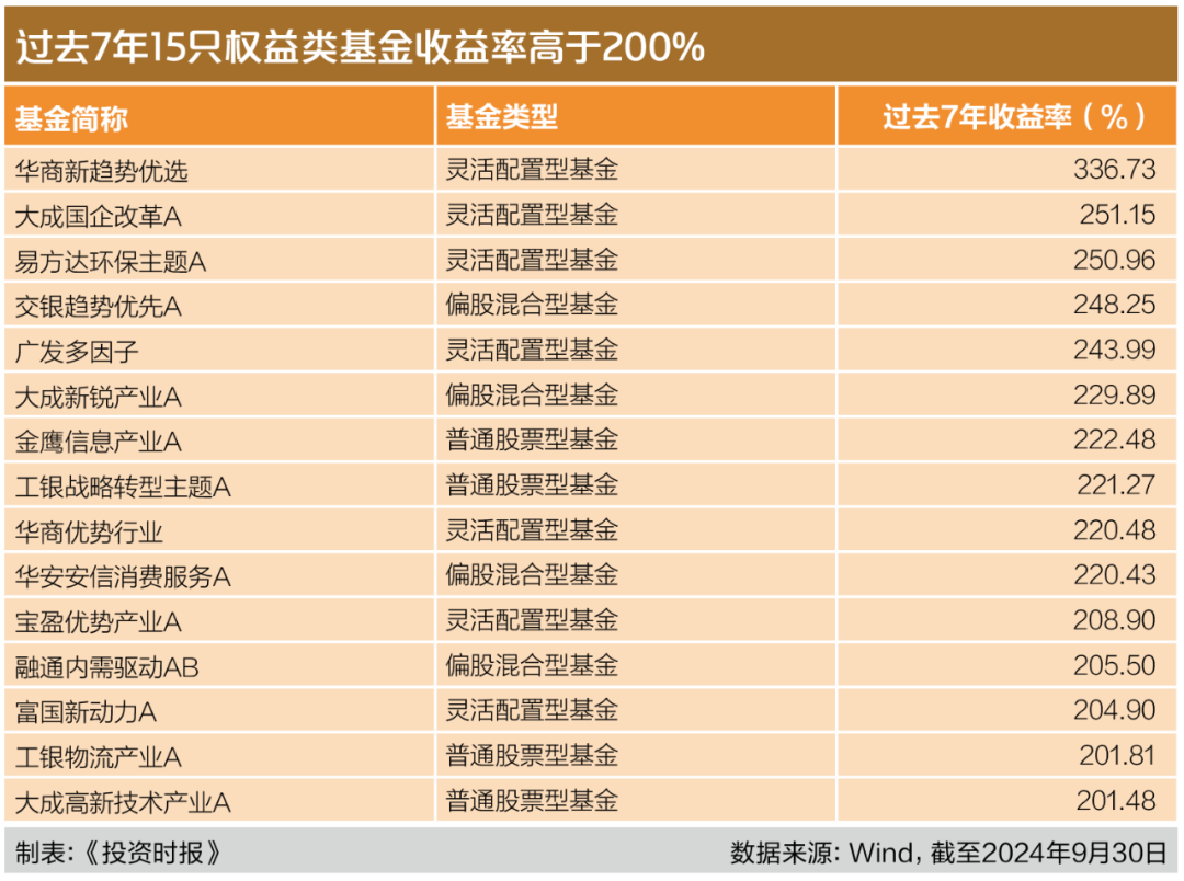 过去7年,权益类基金中收益率超过200%的产品有15只,同时有5只产品净值跌超五成。都有谁?