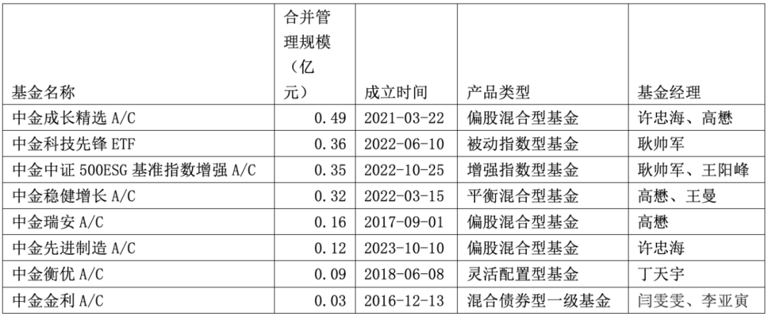 截至2024年三季度末,中金基金旗下有8只基金管理规模低于5000万元(剔除成立时间不满3年的发起式基金)。根据基金2024年三季报披露,这8只基金中,中金成长精选存在20个工作日基金资产净值低于5000万元的情形;中金科技先锋ETF、中金中证500ESG基准指数增强、中金稳健增长、中金瑞安、中金先进制造、中金衡优、中金金利7只产品则皆连续60个工作日基金资产低于5000万元的情形,该公司已向证监会报告并提出解决方案。