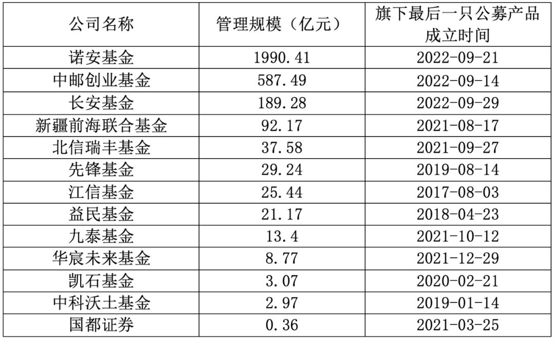 事实上,上述30家公募基金管理机构中,诺安基金、中邮创业基金、长安基金、新疆前海联合基金、北信瑞丰基金、江信基金、先锋基金、益民基金、国都证券等13家基金管理机构有两年以上时间没有新基金募集。