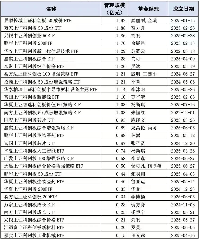 值得关注的是,科创板ETF管理规模分布呈现纺锤型,根据Wind数据,截至7月29日,管理规模超过50亿元的科创板ETF有19只,管理规模在2亿元—10亿元区间的科创板ETF有45只,管理规模不足2亿元的科创板ETF有29只。