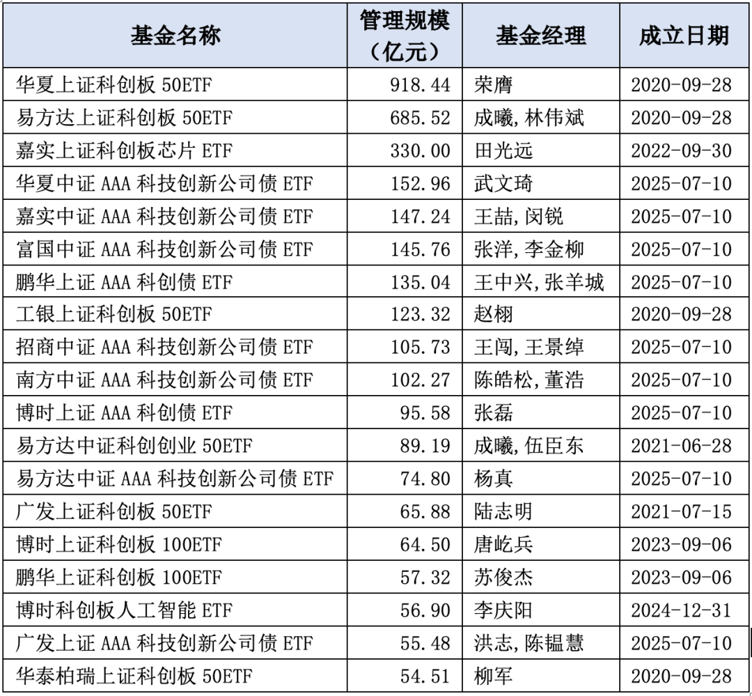 Wind数据显示,截至7月29日,全市场科创板ETF已有107只(各产品类型合并计算,包括科创债ETF,下同),管理规模合计为4008.12亿元。管理规模逾50亿元的有19只基金,其中超过百亿元的有10只。华夏上证科创板50ETF(588000)、易方达上证科创板50ETF(588080)、嘉实上证科创板芯片ETF(588200)管理规模均逾300亿元,稳居科创板ETF前3位。