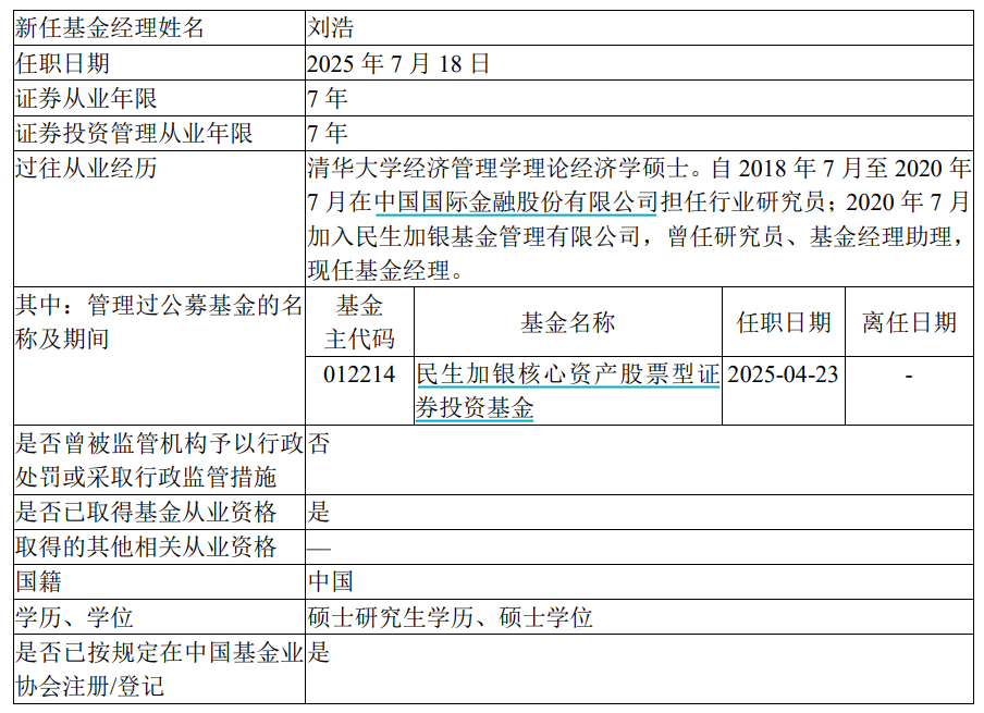 此外,投资时间网、标点财经研究员从民生加银优选基金经理变更公告中看到,该基金当前的基金经理刘浩,有7年证券从业经验,但此前管理过的公募基金只有民生加银核心资产(A类012214,C类012215),任职起始日期为2025年4月23日。从这一信息来看,在接管民生加银优选前,刘浩管理公募基金的时间似乎并不长。