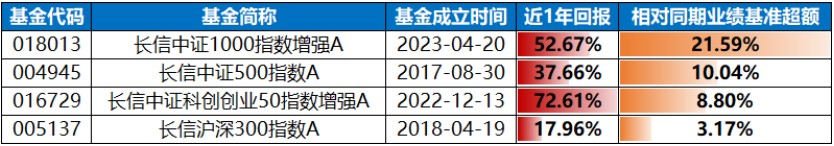 风险提示:以上内容不作为任何投资建议,建议投资者选择符合自身风险承受能力、投资目标的基金。长信上证科创板综合指数增强型证券投资基金、长信沪深300指数增强型证券投资基金、长信中证 500 指数增强型证券投资基金、长信中证1000指数增强型证券投资基金、长信中证科创创业50指数增强型证券投资基金为股票型基金,其预期收益和预期风险高于混合型基金、债券型基金和货币市场基金。长信上证科创板综合指数增强型证券投资基金、长信中证1000指数增强型证券投资基金、长信中证科创创业50指数增强型证券投资基金的投资范围包含港股通标的股票,除了需要承担与境内证券投资基金类似的市场波动风险等一般投资风险之外,还面临汇率风险等境外证券市场投资所面临的特别投资风险。以上产品由长信基金管理有限责任公司发行与管理,代销机构不承担产品的投资、兑付和风险管理责任。我国基金运作时间较短,不能反映股市发展的所有阶段。基金管理人承诺以诚实信用、勤勉尽责的原则管理和运用基金资产,但不保证基金一定盈利,也不保证最低收益。基金的过往业绩并不预示其未来表现,基金管理人管理的其他基金的业绩并不构成基金业绩表现的保证。基金有风险,投资须谨慎。请在购买前认真阅读《基金合同》、《招募说明书》等基金法律文件。