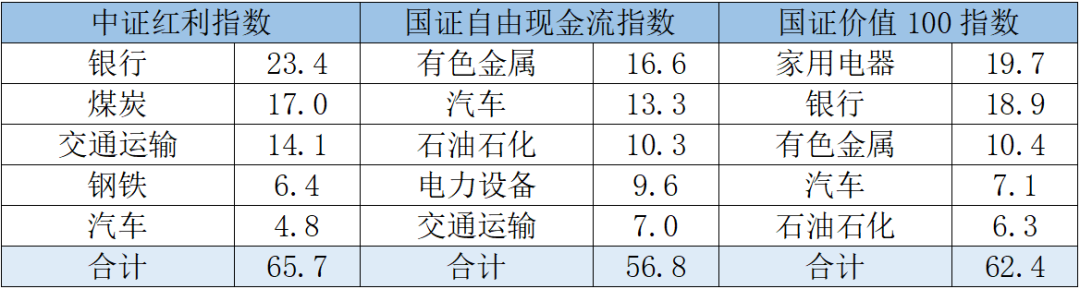 首先,“红利+”策略中不同指数的行业布局呈现鲜明特色,有利于实现风险分散:中证红利指数侧重高股息传统行业,银行(23.4%)、煤炭(17.0%)、交通运输(14.1%)等权重居前,前五大行业合计权重达65.7%;国证自由现金流指数剔除金融、地产,重点布局有色金属(16.6%)、汽车(13.3%)、石油石化(10.3%)等行业,前五大行业合计权重56.8%;国证价值100指数则覆盖家用电器(19.7%)、银行(18.9%)、有色金属(10.4%)等领域,前五大行业合计权重62.4%。